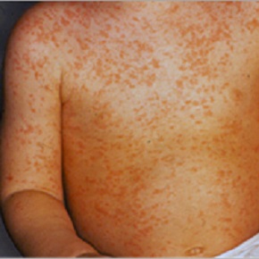 Decorridos 3 a 5 dias do aparecimento dos primeiros sintomas, aparece o exantema típico. As manchas cor-de-rosa escuro iniciam atrás das orelhas e do pescoço e vão alastrando para o rosto, tronco e membros. As máculas poderão originar pápulas. A inflamação ocular, nasal e bucal acentua-se.